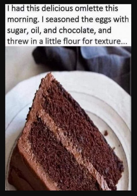 "Сегодня на завтрак я ел вкуснейший омлет. Я приправил яйца сахаром, маслом и шоколадом, добавив немного муки для текстуры..."