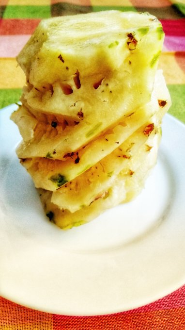 Всем хорош ананас - и вкусом, и калорийностью, если б не его чистка. Давно как-то у азиатов подсмотрел, как они его чистят на весу, вырубая по спирали - пожалуй, самый удобный способ.