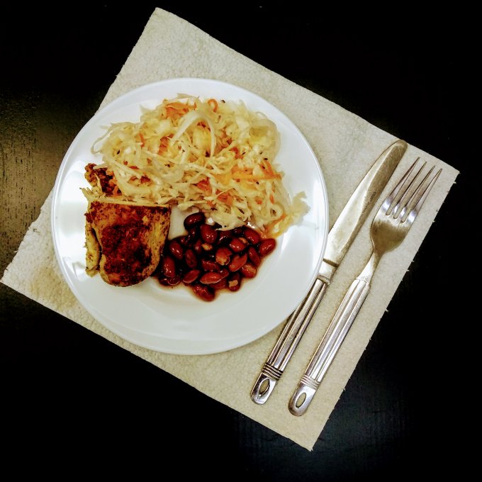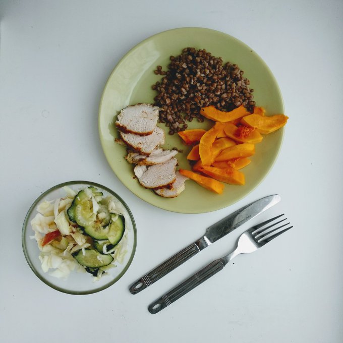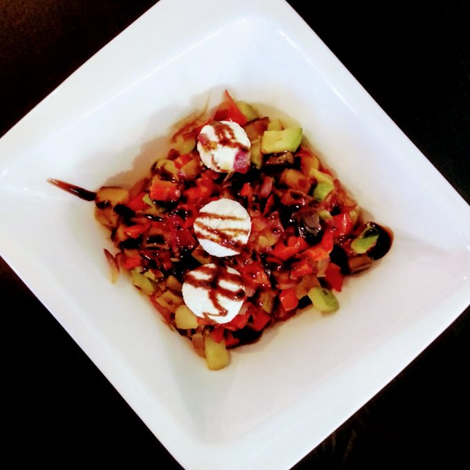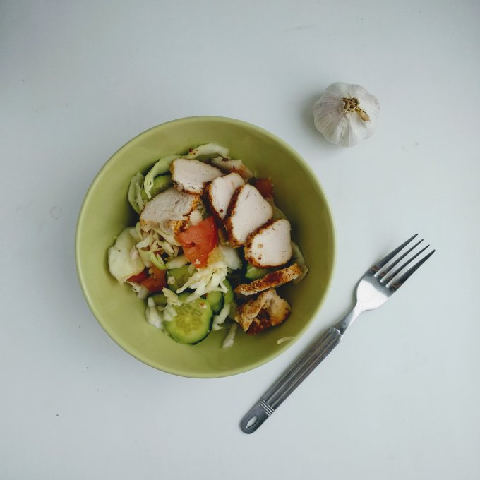 КБЖУ на фото 248/16/16/9, овощной салат (155) с запеченой куриной грудкой (50), оливковым маслом (15) и бальзамическим уксусом.