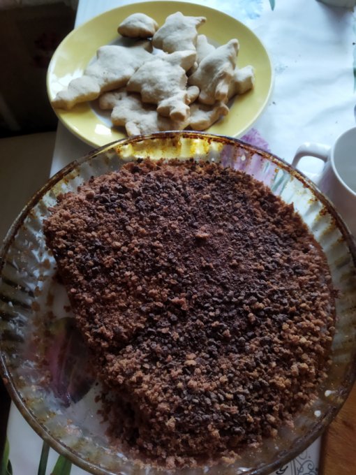 Я не делаю уже разные коржи.. делаю один корж..остатки на блендере и посыпаю.сверху черный шоколад