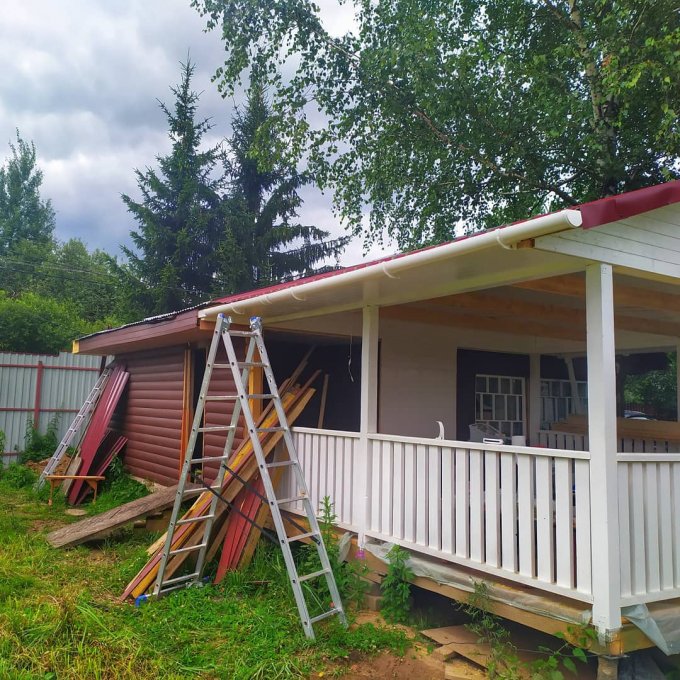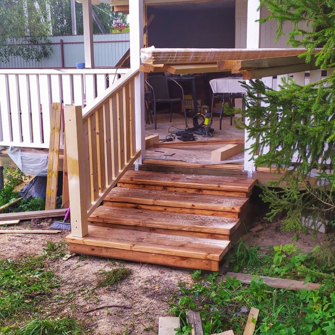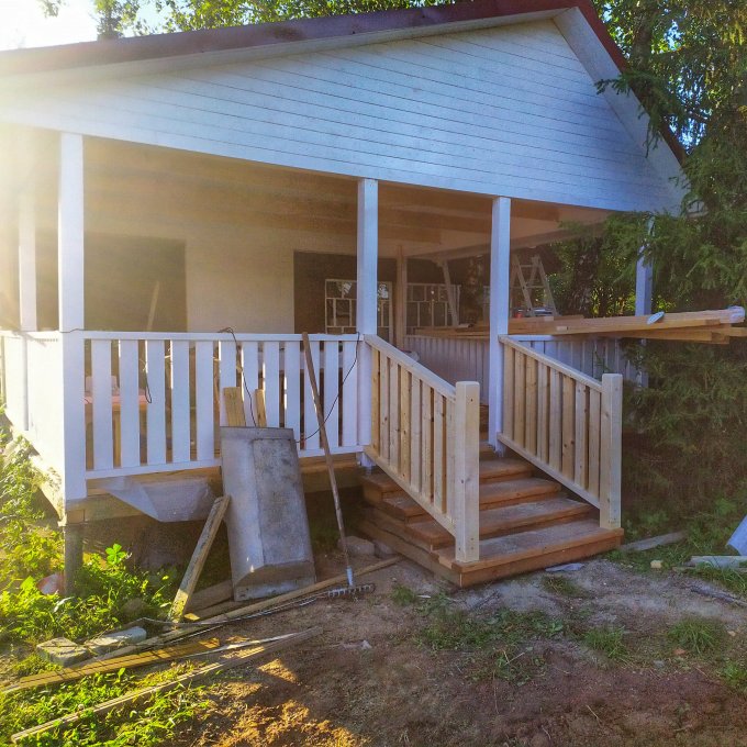 На веранде(вот уж реально долгострой вышел), осталось только отшлифовать и покрыть чем-то пол. Дамы опять в раздумьях чем именно. )