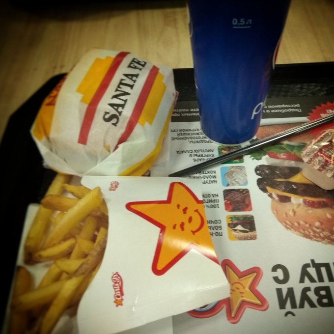 Бургер куриный с халапеньо, картоха фри, и в лучших традициях кола зеро.