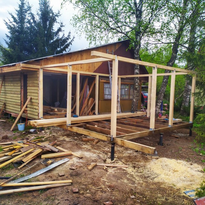 Обвязка готова. Привезли стропила. Завтра буду корячить. Очень ювелирная работа. Доски 5 и 2.4 метра, должны сойтись в коньке со старой крышей.