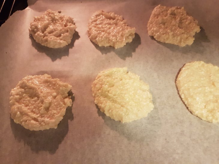 На бумагу для выпечки ложкой выкладываем получившуюся массу, ставим в разогретую до 180 градусов духовку на 20-25 минут.