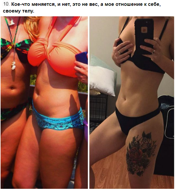 И да. Года через 2-3 таких чередований можно сделать красивое фото типа - вот я вешу 70 и страшная, а вот я вешу 80 и шикарно выгляжу. Но это потом.. По этим фото создаётся обманчивое впечатление, что это как-то вот одномоментно произошло.