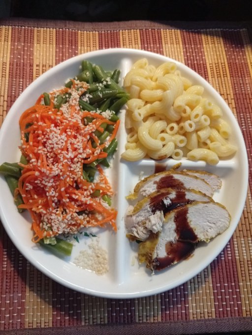 Кошь, Отваренная зелёная стручковая замороженная фасоль из пачки, сверху - магазинная морковь по-корейски, сверху - посыпано кунжутом)