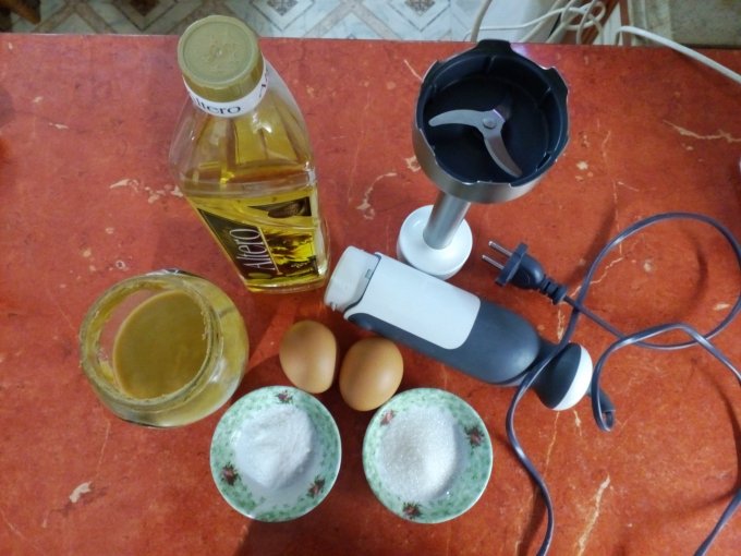 Приготовить масло, яйцо, горчицу, соль, сахар,уксус, стеклянную банку и блендер