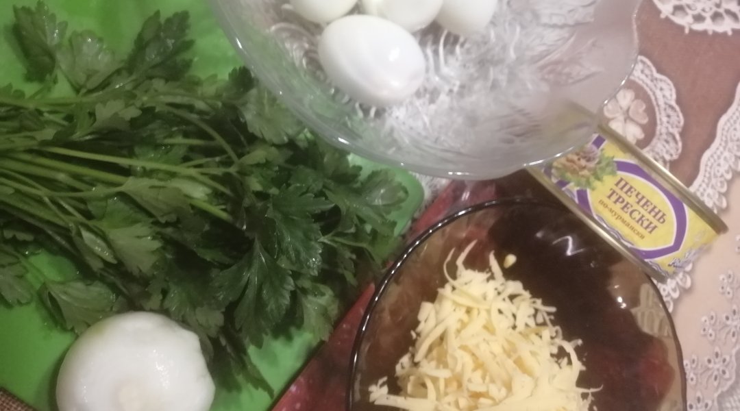 Сварить яйца, почистить лук, натереть сыр. Порезать яйца, лук, петрушку.