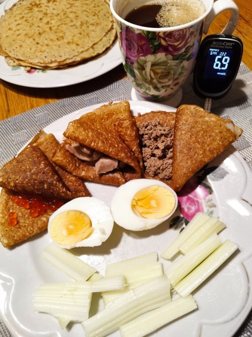 На завтрак, конечно, мимо блинов пройти не смогла. Но они у меня с правильной начинкой, это успокаивает!)))