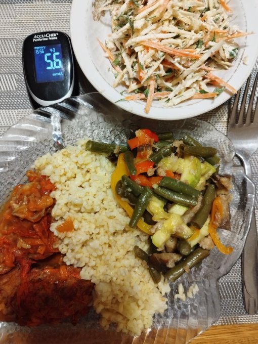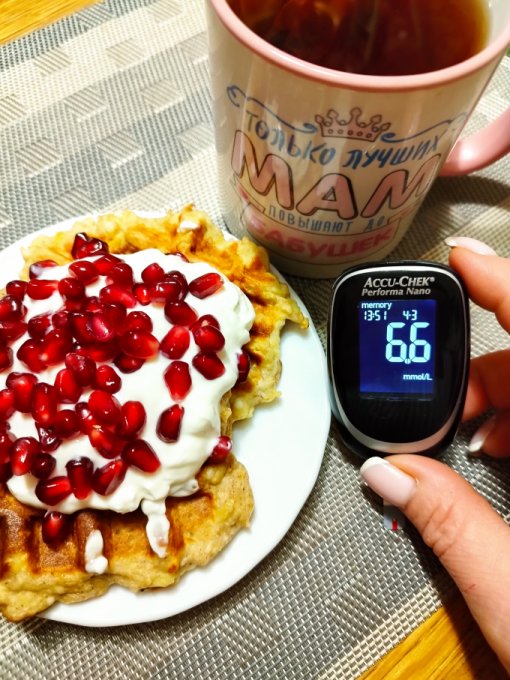 Завтрак сегодня быстрый, проспала, бежала на собрание. В 9:40 натощак 6,4 Через два часа после завтрака сахар 9,5 обхожусь без перекуса. В обеденное время сахар 6,6 сделала перекус с творожными вафлями, греческим йогуртом и гранатом. Как-то неправильно ем сегодня. Пошла шевелиться в уборке Выходной ...