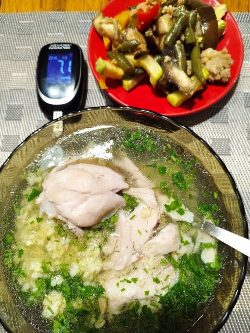 Сварила курицу,захотелось куриного бульона. Вспомнила, что куча калорий сегодня недоедена, добавила в бульон варёный булгур, петрушку, курицу. Ну и овощей уже для правильности. Получился полноценный ужин)