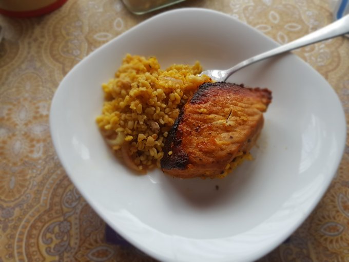 Сегодня у меня было полное ощущение, что я готовила sunday roast как в британских передачахх, когда что-то долго запекается в духовке, когда идёт предвкушение и ожидание, создаётся ощущение праздника. Готовила нежирную мякоть свиной корейки с луком и булгуром, специи были готовые. Булгур вышел восхитительно, впитал специи, лук карамелизовался и тает во рту. Мясо на мой вкус чуть суховато, но это ожидаемо, кусок выбирала наиболее постный. На фото видно корочку, нет, она не подгорела, на фото вышло потемнее. Это прекрасно. Я даже не волнуюсь, что так и не нашла похожей на правду калорийности корейки. Я купила её в Ленте, а там почти всё мясо, что я беру, выходит 200 ккал на 100 г. Я видела в интернете и значения по 390 ккал. Но у меня мясо было нежирное, так что взяла значение из Ленты, ну а что будет с весом и талией, покажет время.) Даже если там лишние 300 ккал, это не будет перееданием, а останется в рамках приличия. В общем, вкусное, ароматное и очень мясное блюдо сделало мой день.)