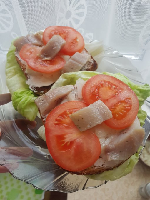 И последнее: рубрика "ленивая жена кормит бутербродами". Тостовый хлеб с отрубями, творожный сыр с травами, маринованный лук, сельдь в масле, томаты и айсберг. Свежо, сочно, пикантно, очень вкусно. Завтра буду пробовать знаменитый рецепт, где делается яичный сендвич с сыром внутри, его из любого утюга демонстрируют.