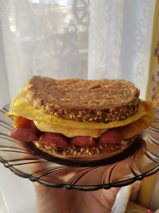 Нандор Безжалостный, кстати да, похоже ведь! Только крок мадам готовится с ветчиной, сыром и яйцом, если я верно помню, тоже классная штука, как-то делала. А я делала модный в интернетах сендвич, где хлеб жарится в омлете и омлет сворачивается кармашком.