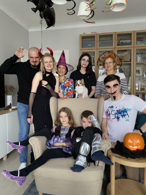 костюмы, сидели за столом и смотрели всей семьёй мультфильм