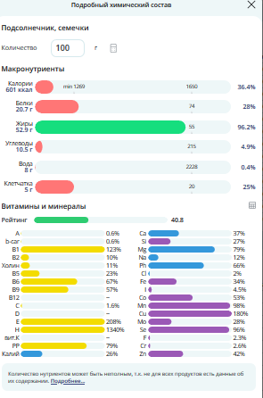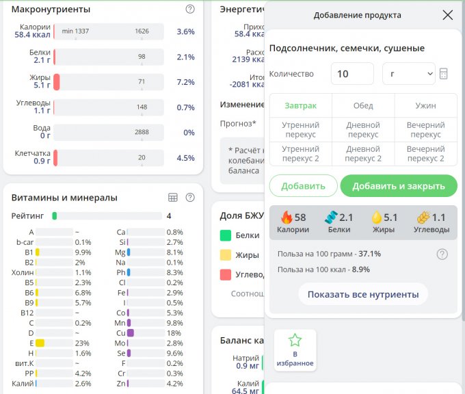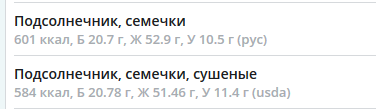 Lara, может быть что-то изменилось в базе  я помню, у меня на первых порах семечки тоже прямо давали хорошую прибавку к микронутриентам, хотя я и не следила, по какому именно витамину, а потом перестали, сейчас я их уже добавляю только чтобы по жиру/белку догнать.
