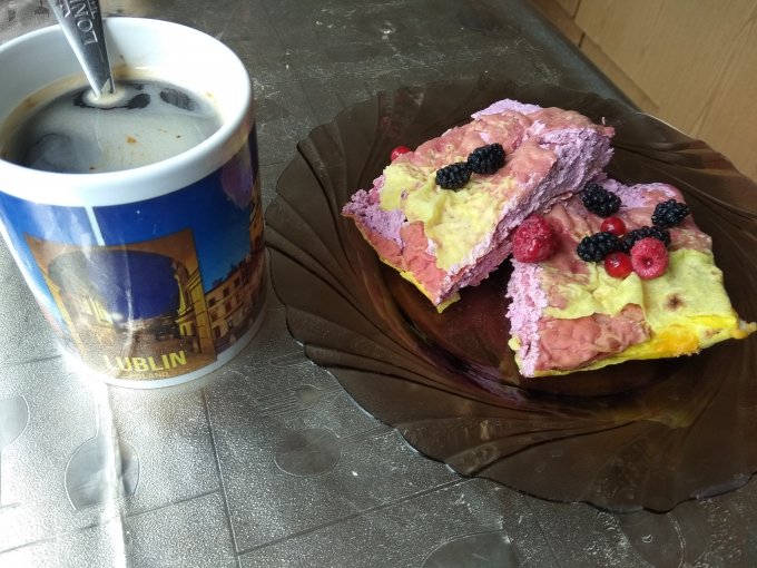 Я творог взбила со смородиной, малиной и шелковицей. Добавила подсластитель, 1 яйцо, 1 белок. Выложила все тонким слоем на лаваш. Свернула рулетом. Смазал желтком и запекала 20 минут в духовке.