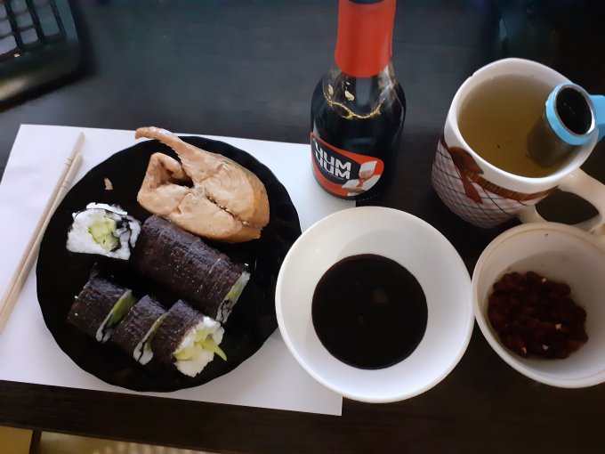 Обед: хосомаки (суши-ролл с одним огурцом), рыба красная (кета на