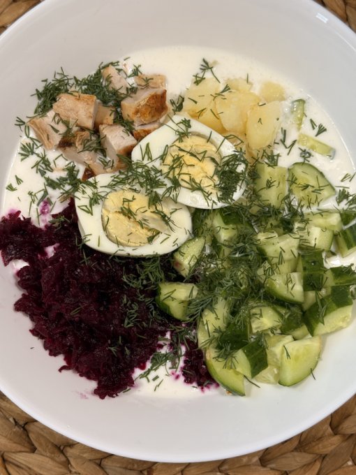 У нас пришла неделя лета. Стараемся максимальное время проводить на прогулке. Дома сезон холодных обедов. Сделала окрошку с куриной грудкой и йогуртом. Сытно и по-летнему.