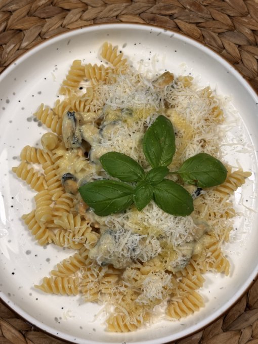 Добавила в пасту мидии в качестве источника белка. Пусть белка там не так много, зато стоят недорого и разнообразят рацион.