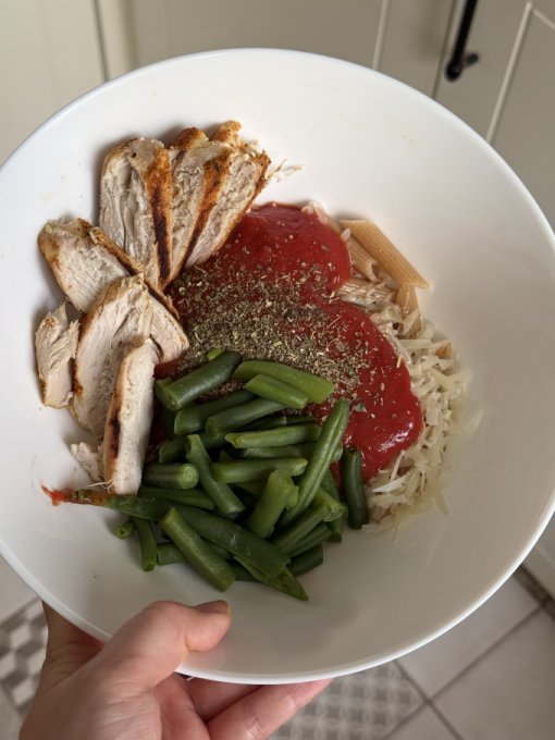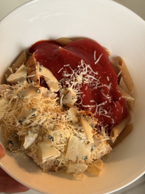 Сегодня у нас дождливая погода. Захотелось пасты. Хорошо, что в запасах нашлись и макароны, и пармезан, и томатный соус. Курицу пожарила на гриле сразу на несколько дней.
