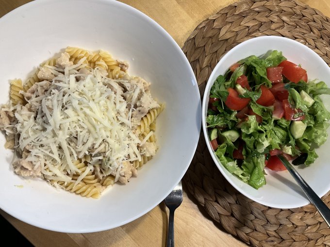 Сегодня было побольше времени на готовку, поэтому паста с соусом. А в остальном мало отличий от вчерашнего рациона.