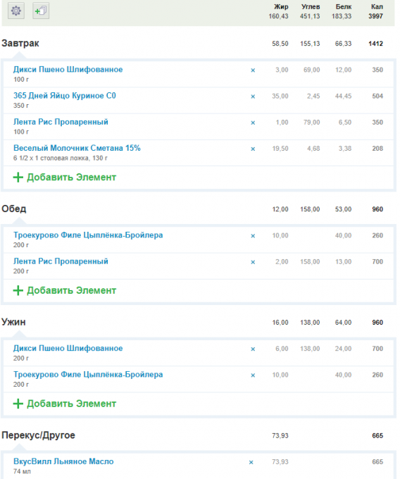 Lara, льняное, да, в течение дня в крупу добавлял. Про белок - 183г за день, куда уж больше с моим весом?) Читал здесь же на Зожнике, что для сохранения и роста мышечной массы нужно есть 1.6-2 г белка на килограмм массы, довольно адекватно написано на мой взгляд, решил довериться этой информации: https://zozhnik.ru/gid-po-belkam/ .. Я же съел в тот день 3г на килограмм веса). Углеводы очень важны, с ними больше сил в течение дня, особенно, когда весь день нагрузка. Поэтому решил побольше их есть. С овощами - да, здесь недочёт, буду исправлять в будущем.
