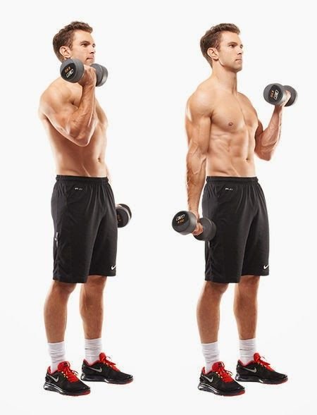 Взять в обе руки по гантели подходящего веса, удерживая снаряды в