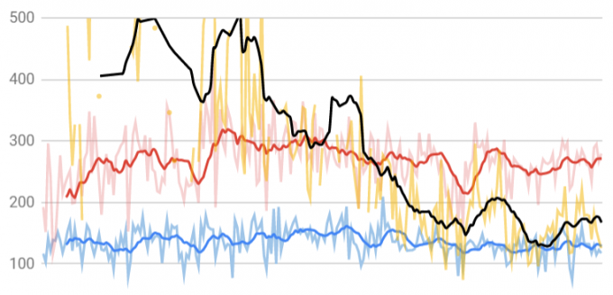 До зожника вел учет еды в гугл таблице, с июня 2021 по март 2022. Красное калории (/10), синее -- белок, черное -- стоимость. С 400-500 руб сократил расходы до 100-150 и улучшил качество пищи (содержание витаминов/минералов). Калории и белок без изменений, на уровне примерно 3000/120.