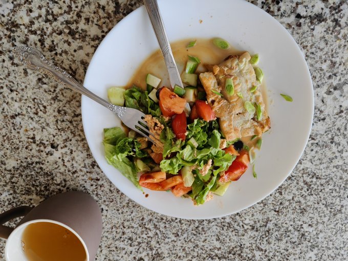 5 день. Открыла для себя филе камбалы. Бруски по 120 грамм примерно. Бросаешь на сухую сковородку, с двух сторон немного обжариваешь, кипятка туда, и, пока делаешь салат, рыба уже готова.