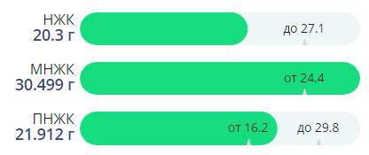 Сегодня весь день была дома. Немного превысила норму жиров, но уже меньше, чем до этого.