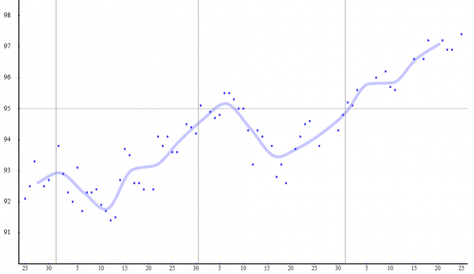 Вот допустим скрин набора веса. Точка - измерение. Линия - усреднение. И как бы там не прыгал вес в течении нескольких дней общая тенденция к набору видна.