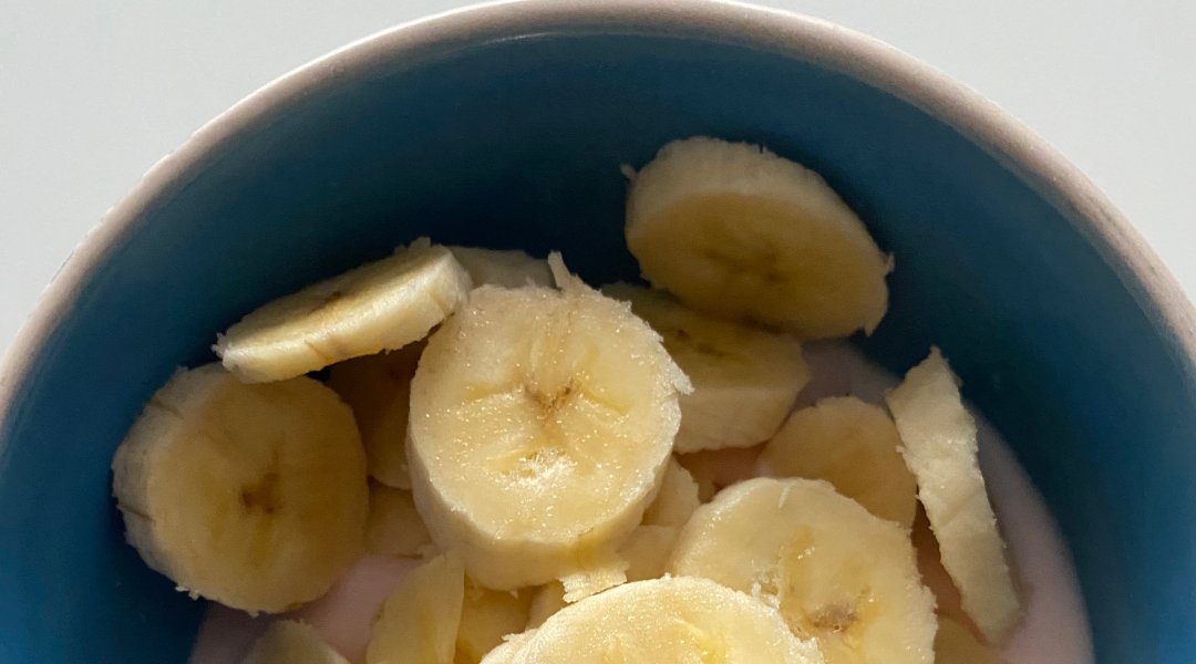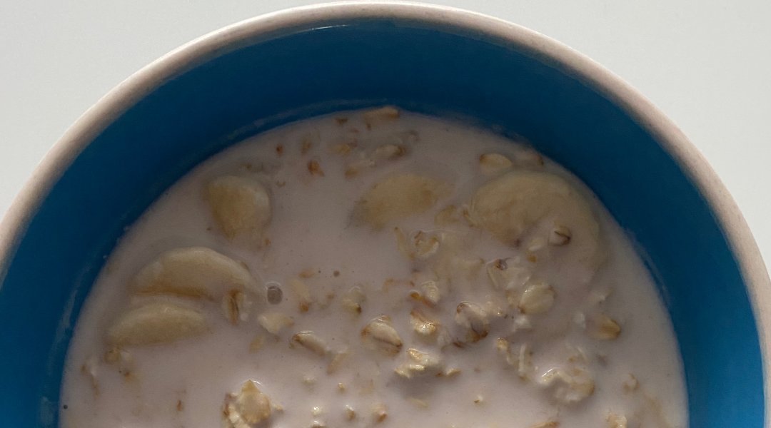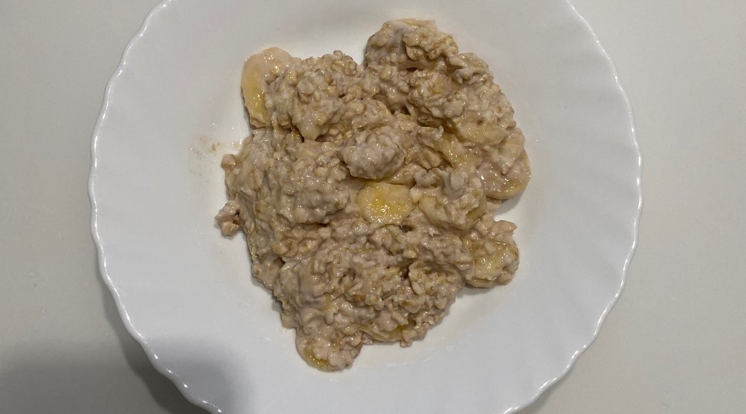 Геркулес (у меня 15-и минутка) залейте йогуртом и добавьте банан нарезанный так как вам нравится. Если йогурт густой, то можно добавить молока.