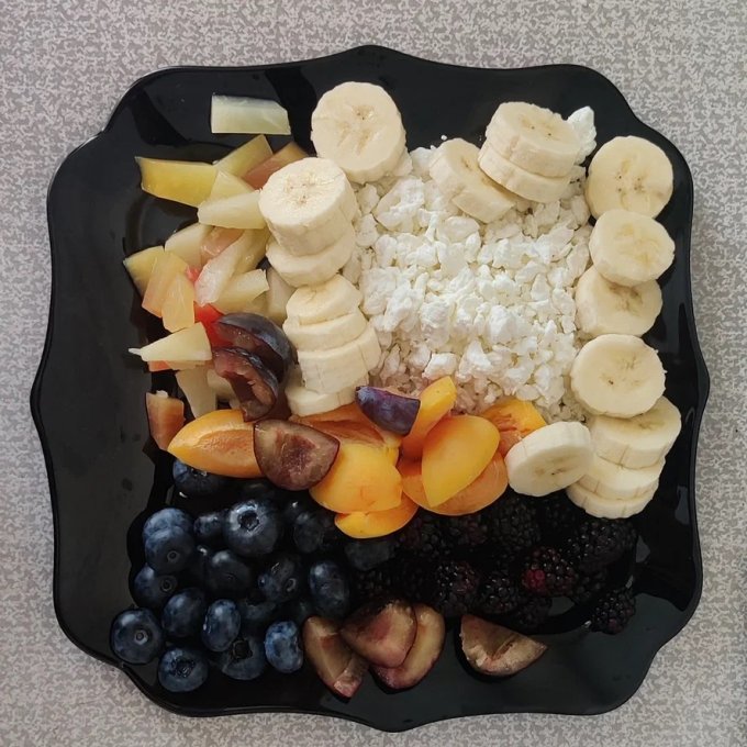 Это один из моих завтраков, тут немного ежевики, сливы, абрикоса, голубики, тропических консервированных фруктов, банан и творог 5%. Очень вкусно и сытно.
