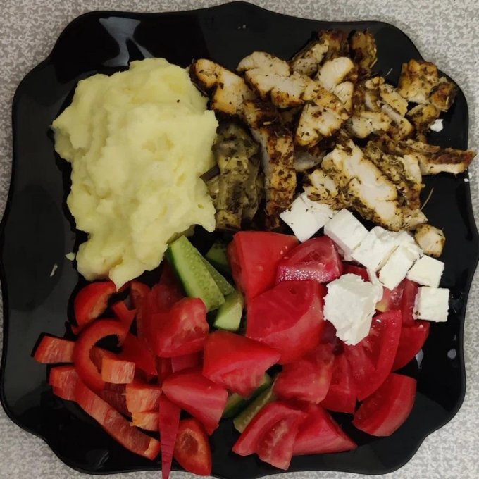 Тут картофельное пюре (сдобренное сливками), огурец, помидор, перец красный сладкий, брынза, баклажан запеченный с травами, филе курицы с паприкой и набором итальянских трав.