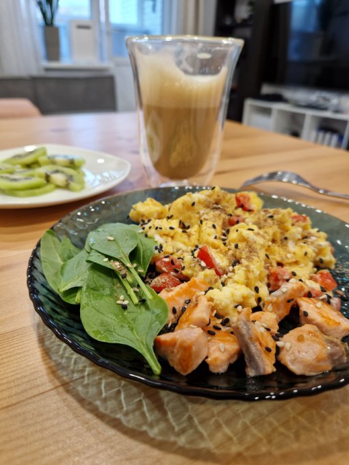 Омлет с сыром, помидором. Рыбка форель готовлю рядом с омлетом в одной сковороде 😉 Вкусный и полезный завтрак за 10 минут