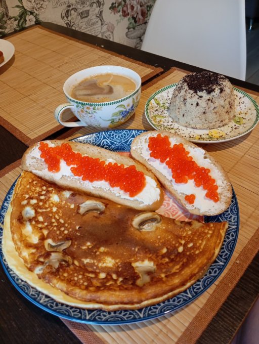 Завтрак: омлет, бутерброды и кекс в кружке. Горсть вкусных таблеточек)))