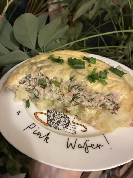 Картофель отварила, размяла, сформировала из него «тесто» с бортиками как основу пирога. Пока стоял в духовке, приготовила начинку: банка консервированного тунца, йогурт, яйцо, зелень. Влила начинку в подзапекшуюся основу, посыпала сыром и опять в духовку.