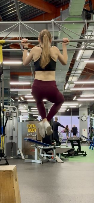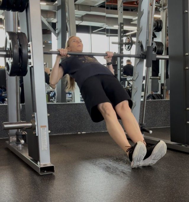*В первом круге, как всегда, делала австралийские в Смите, но пока ходила выпадами по залу, тренажер у меня увели 😆. Пришлось искать замену. Резин для подтягивания в зале нет, с собой взять как-то не подумала, решила поделать негативные - вполне себе приличная альтернатива, имхо)