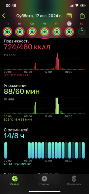 Нормальная силовая суббота. Только работы чуть больше обычного. Ну и вместо ТЗ сходила на круговую. Расход ккал по часам - 724.