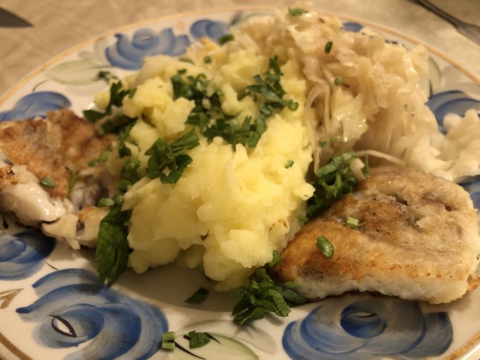 На ужин - рыба. Четверг же! С пюре и квашеной капустой.