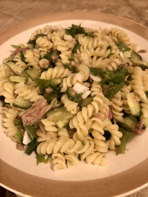 На обед планировался теплый салат с макаронами, тунцом, салатом, огурцом и яйцом, но я была очень голодная и не пожадничала с макаронами и… Ну короче, макароны с огурцом получились)))