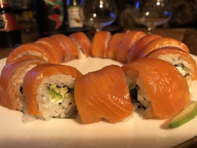 Делали Филадельфию. Два ролла. Один с кубанским рисом, другой - со специальным для японской кухни. Разницы на вкус никакой) Внутри сливочный сыр, огурец, авокадо, а в некоторых - палочки «снежный краб».