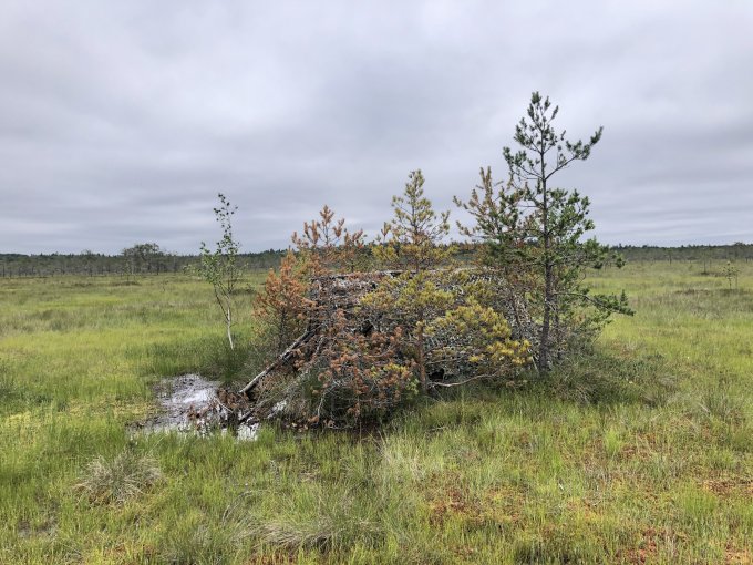 "Странная конструкция в самом сердце болота. Какая-то времянка, ещё и скамейка внутри." — прям любопытно что за конструкция, выглядит прикольно и деревья хорошо дополняют картину.