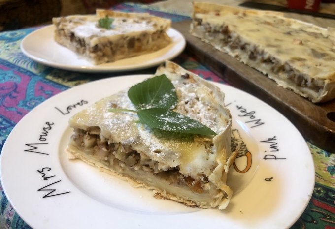| Ленивый киш с яблоком, грецким орехом, изюмом |