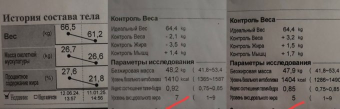 За 7 месяцев ушло 5.3 кг., из них 100 гр. мышц. Не знаю насколько можно доверять этим данным, показывает что в ногах превышение мышечной массы, а в руках недостаток жировой массы, а была норма. Как по мне моим рукам явно не хватает мышц 😁