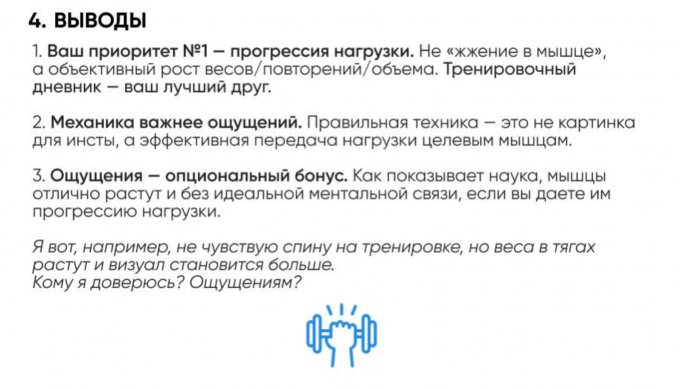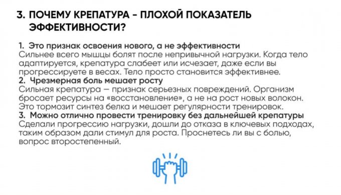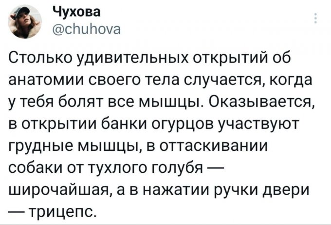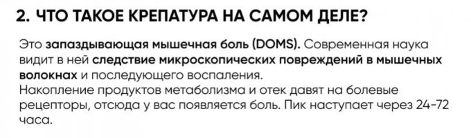 "Когда мышца крепатурит, я понимаю, что нагрузка попала туда, куда я целила, даже если в процессе было непонятно, работают нужные мышцы или нет)" — да-да, у меня тоже в голове куча противоречивой информации и когда непонятно чем делала, выбираю верить крепатуре 😉 но не могу сказать что я ее люблю, особенно когда она вторую неделю по разным причинам появляется.